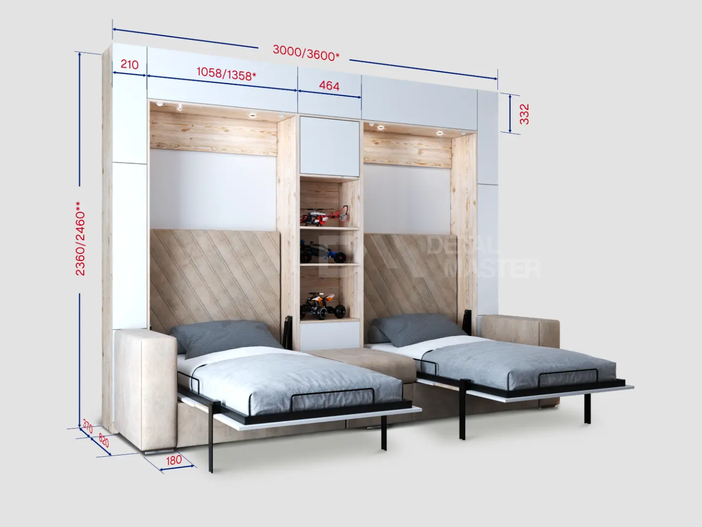 Дополнительные опции, такие как: освещение, зарядное устройство, розетки, мягкое изголовье, матрас, мягкий борт - не входят в стоимость шкаф-кровати "Twin". Вы всегда можете самостоятельно их добавить в опциях или написать менеджеру при оформлении заказа.